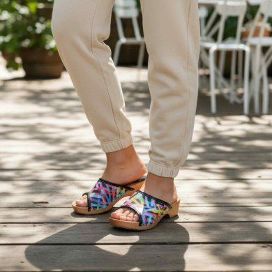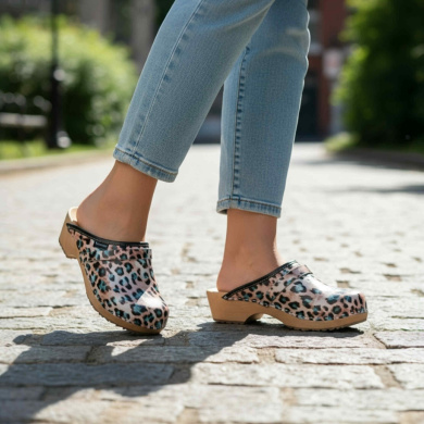Drewniaki damskie Naturfeet DKC6PA ze skóry naturalnej w panterkę – boho chodaki na platformie