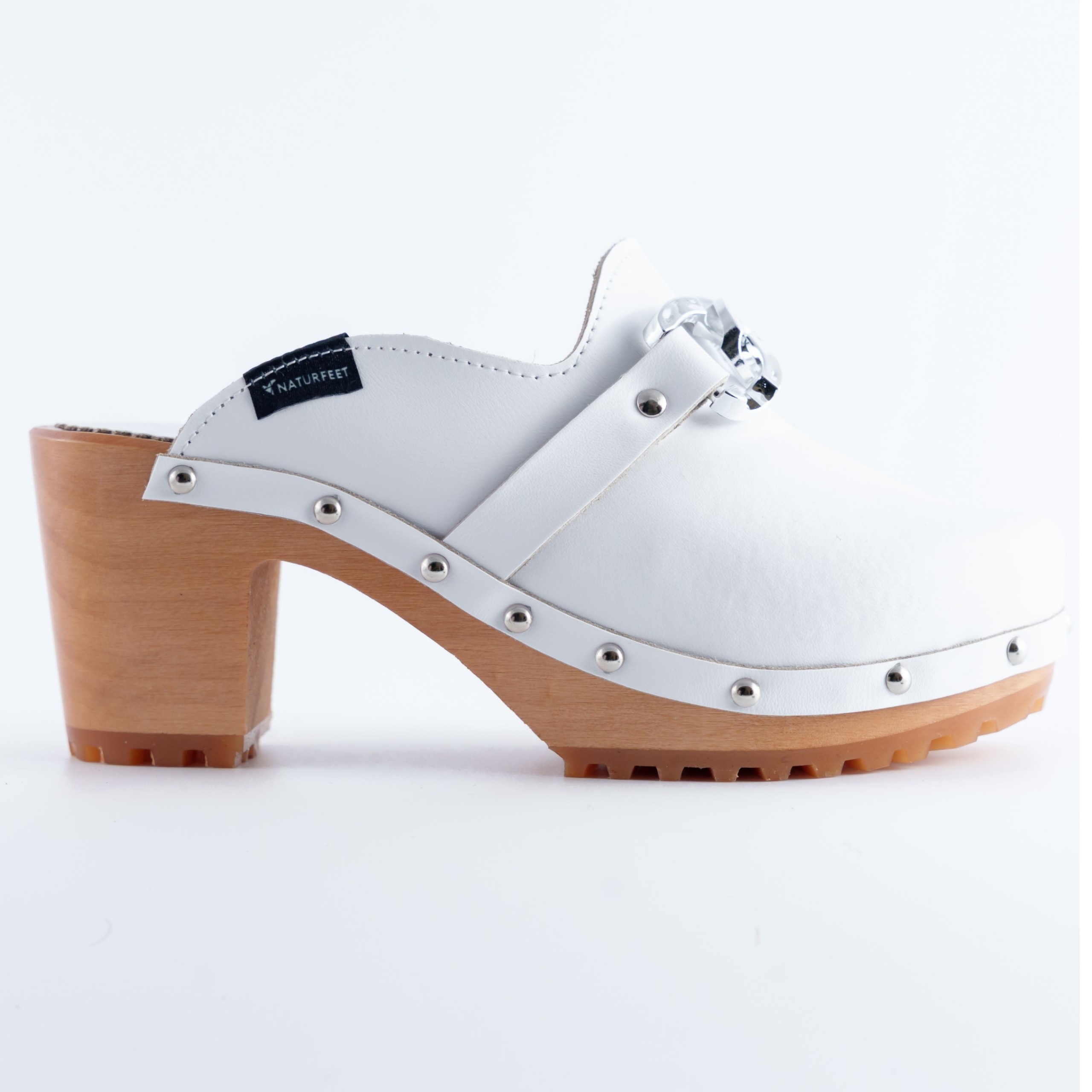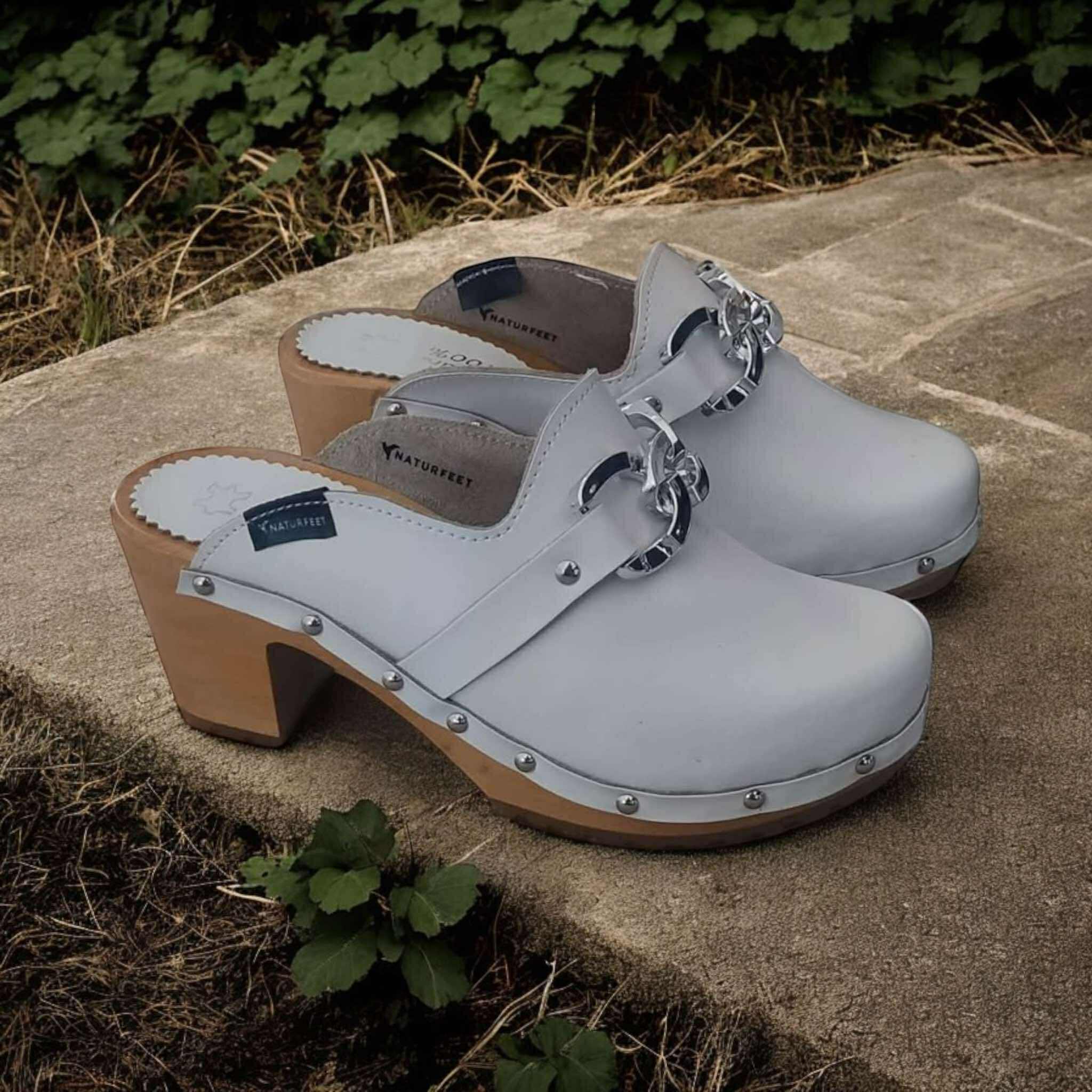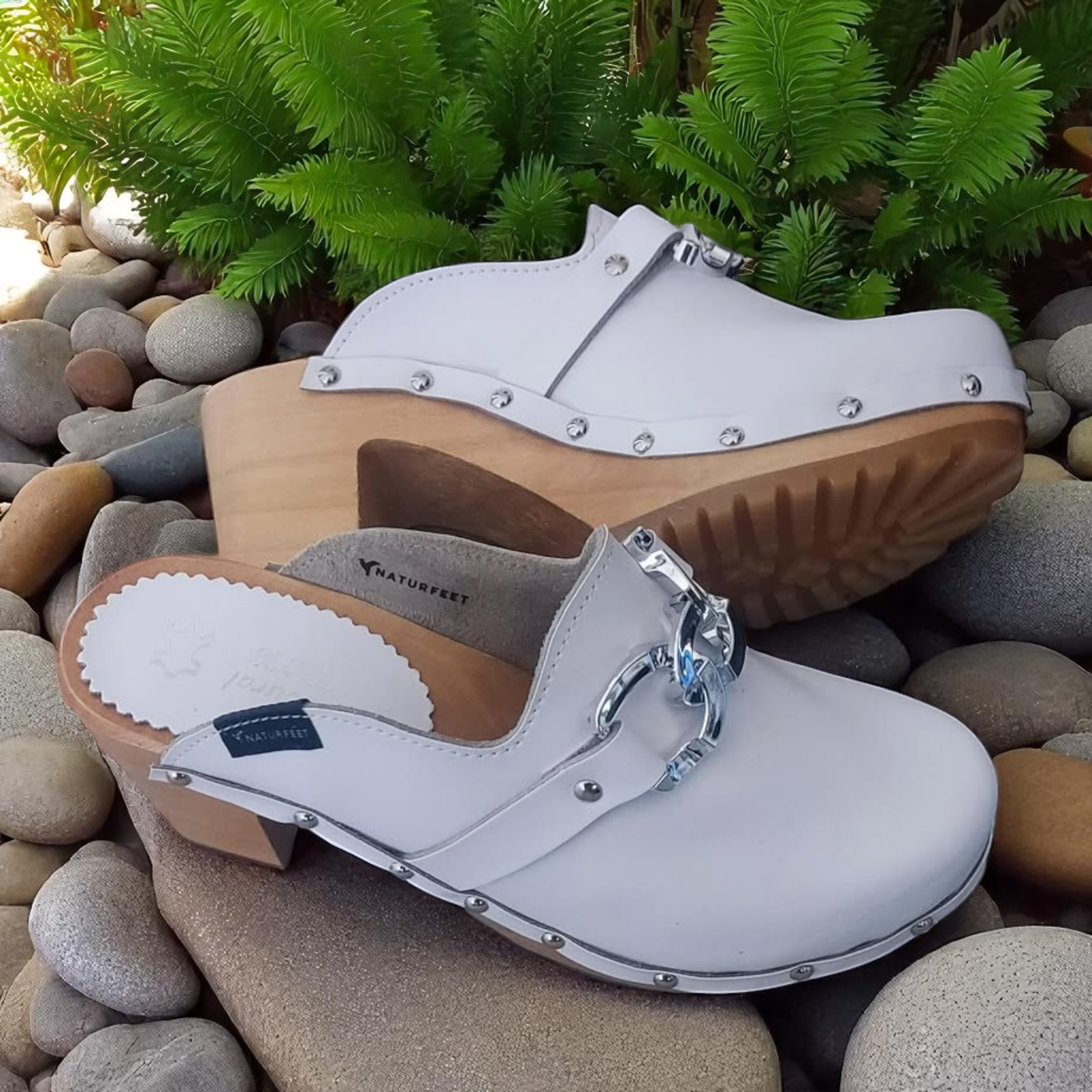 Postaw na elegancję i komfort z damskimi drewniakami marki Naturfeet. Wykonane z naturalnej skóry i osadzone na stabilnym, drewnianym obcasie o wysokości 7,5 cm, łączą w sobie klasyczny design z nowoczesnym akcentem. Stylowe metalowe zdobienie i wykończenie nitami dodają im charakteru. Idealne do letnich stylizacji – zarówno codziennych, jak i bardziej eleganckich.