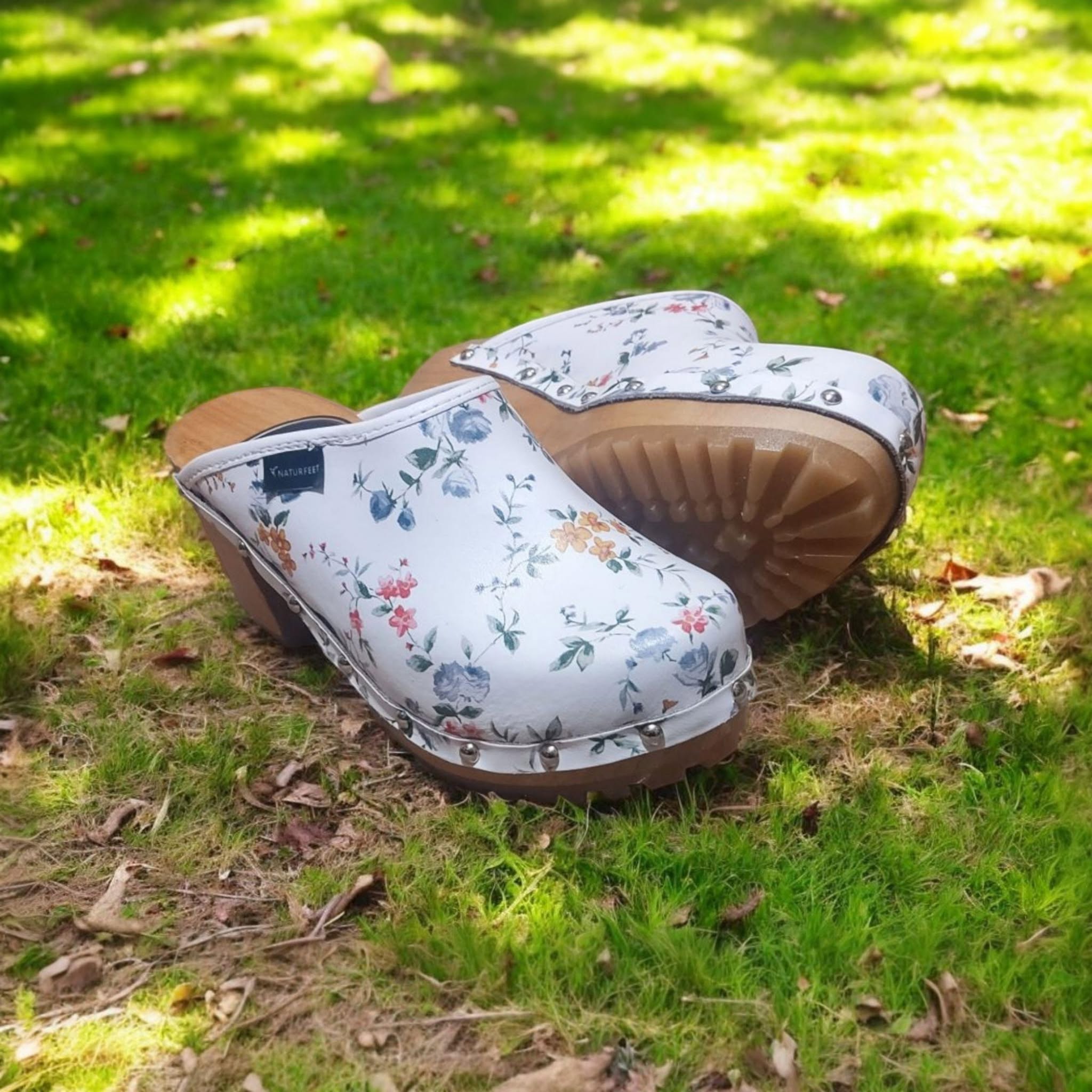 Damskie drewniaki Naturefeet DH5WH z naturalnej skóry z kwiatowym wzorem komfortowe obuwie na obcasie – klasa i elegancja