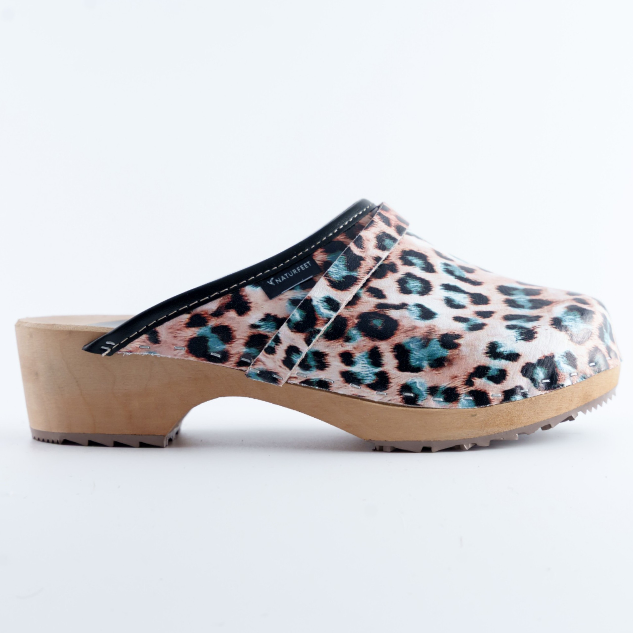 Drewniaki damskie Naturfeet DKC6PA ze skóry naturalnej w panterkę – boho chodaki na platformie