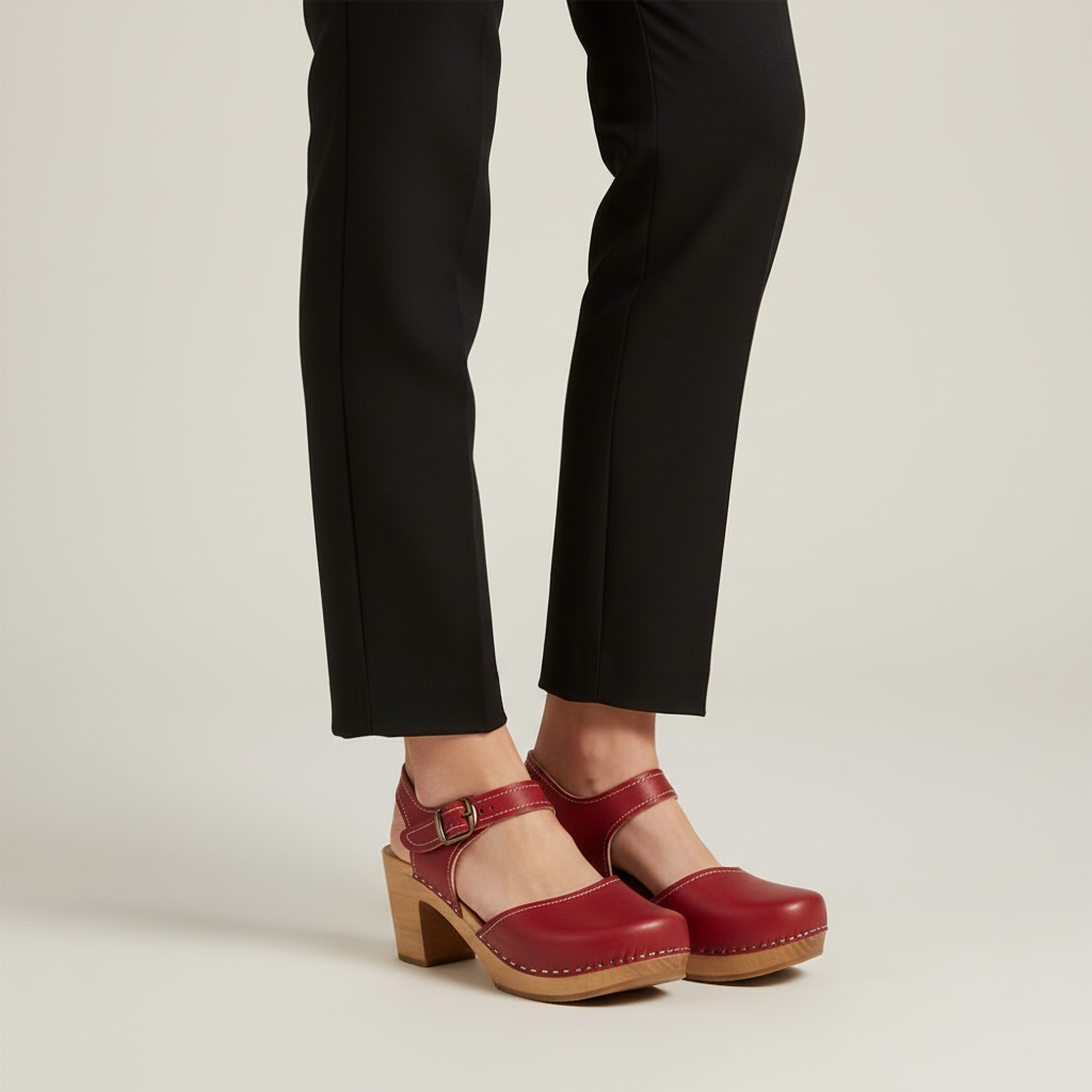 Solidna podeszwa z naturalnego drewna olchowego gwarantuje stabilność i trwałość, a obcas o wysokości 7,5 cm subtelnie wysmukla sylwetkę, zachowując wygodę użytkowania.
