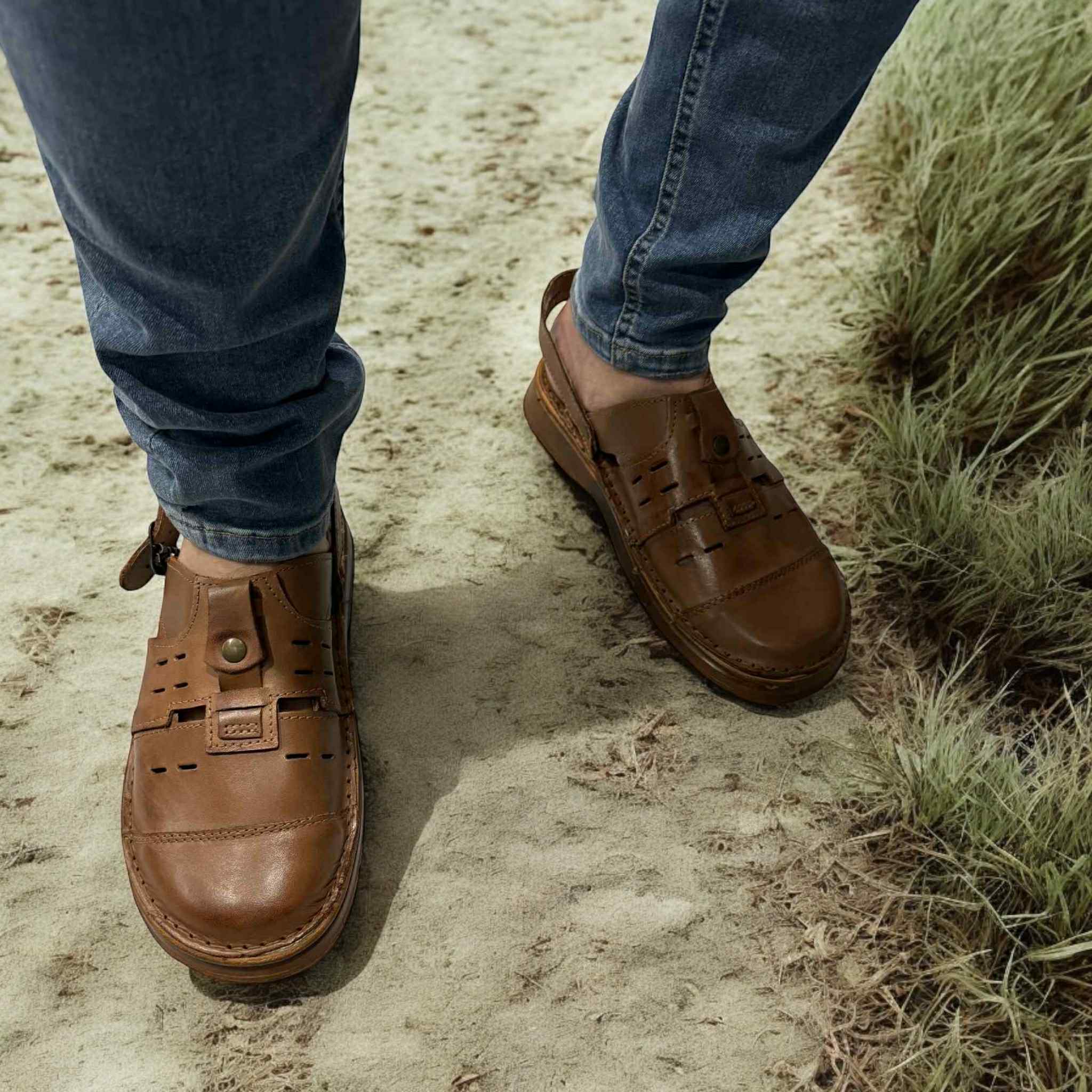 Postaw na wygodę i styl z klapkami męskimi marki Naturfeet, wykonanymi z najwyższej jakości naturalnej skóry. Dwa w jednym – klapki jeżeli zapięcie włoży się nad cholewkę, bądź sandały z zakrytymi palcamiTen model wyróżnia się oryginalnym wzornictwem z ozdobnymi przeszyciami i perforacjami, które zapewniają doskonałą cyrkulację powietrza. Regulowane zapięcie na klamrę oraz dodatkowe zapięcie na zatrzask gwarantują idealne dopasowanie do stopy. Antypoślizgowa podeszwa dba o stabilność, a miękka wkładka o komfort noszenia przez cały dzień. Idealne zarówno do domu, jak i na zewnątrz.