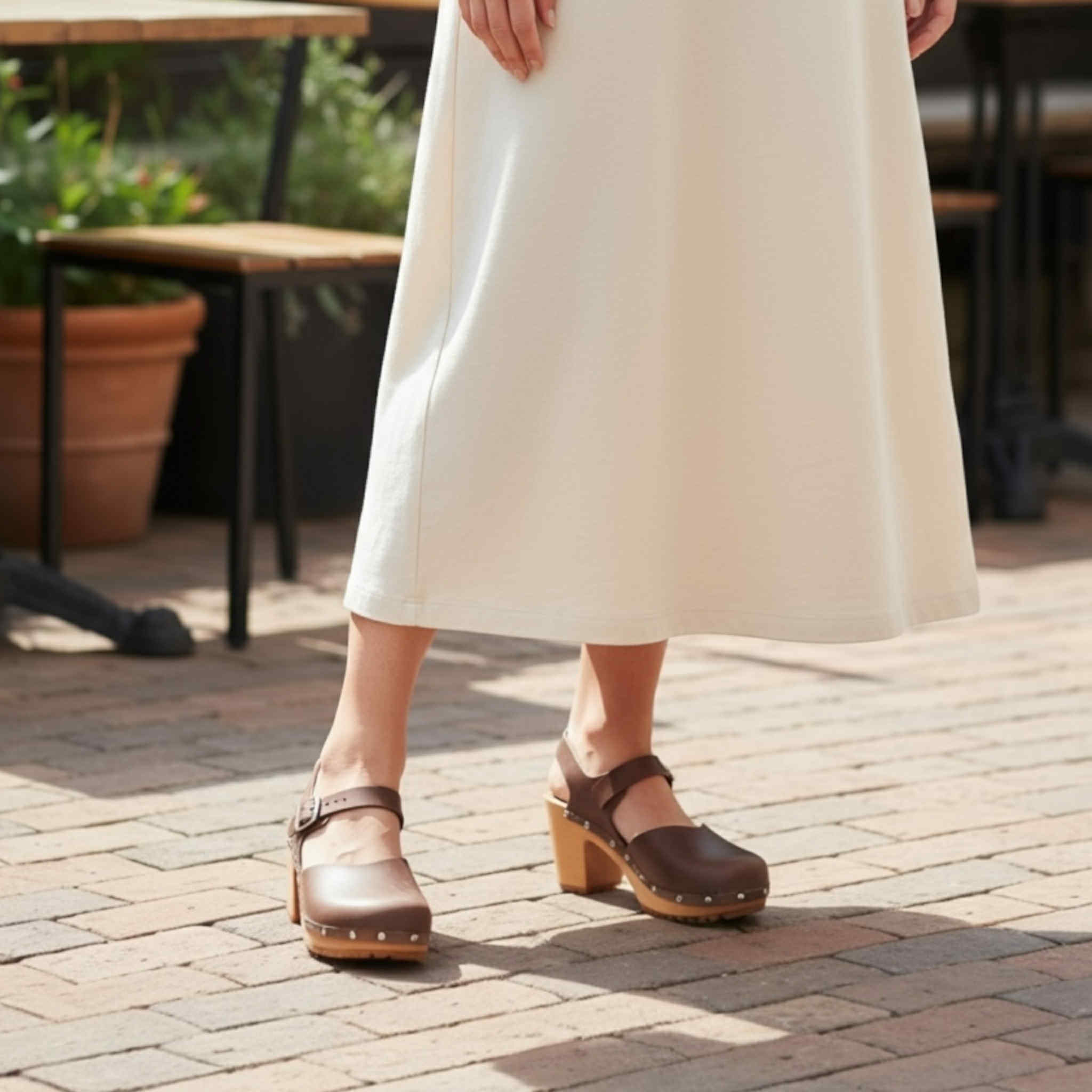 Postaw na ponadczasowy styl i wygodę dzięki tym ręcznie robionym szwedzkim chodakom. Wykonane z naturalnej brązowej skóry i solidnej drewnianej podeszwy, sandały te mają stabilny obcas na platformie oraz regulowany pasek na kostkę. Srebrne nity dodają im charakteru, a ergonomiczny kształt zapewnia komfort noszenia przez cały dzień. Idealne na wiosnę i lato – sprawdzą się zarówno na spacer, jak i na spotkanie z przyjaciółmi.