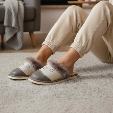 Damskie kapcie zimowe Naturfeet PKW5GR szare – skóra naturalna z haftem futerko i lekka podeszwa