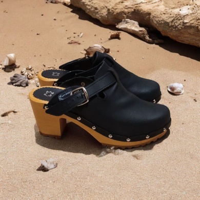 Damskie chodaki Naturfeet DH6CO z naturalnej skóry w krowie łatki – drewniaki na wysokim obcasie