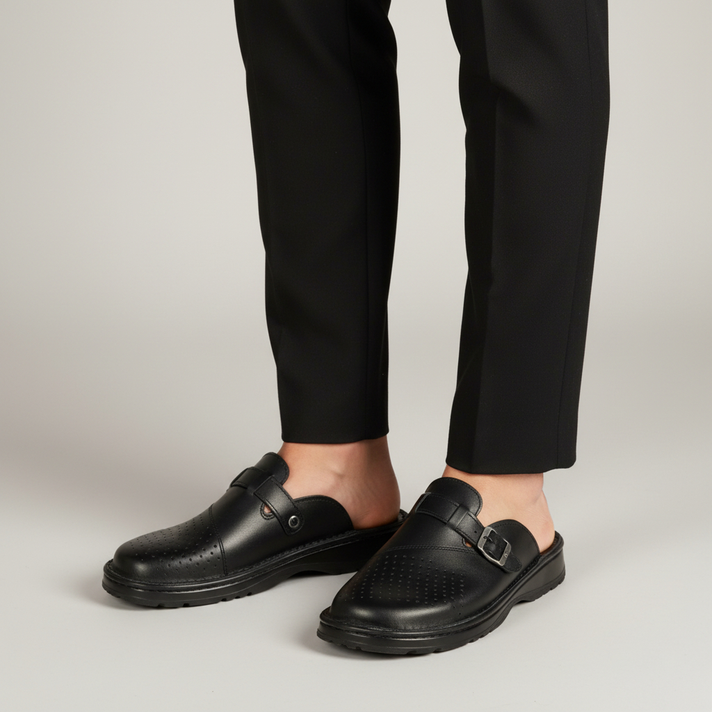 Poznaj klasyczne skórzane klapki męskie, które łączą elegancję z codzienną wygodą. Wykonane z wysokiej jakości skóry naturalnej w eleganckim czarnym kolorze, wyposażone w praktyczne zapięcie na klamrę dla lepszego dopasowania. Perforowana cholewka zapewnia wentylację, idealną na cieplejsze dni, a solidna, gumowa podeszwa gwarantuje trwałość i przyczepność. Doskonałe do noszenia w domu, ogrodzie czy na spacerze. Postaw na komfort i klasykę każdego dnia!